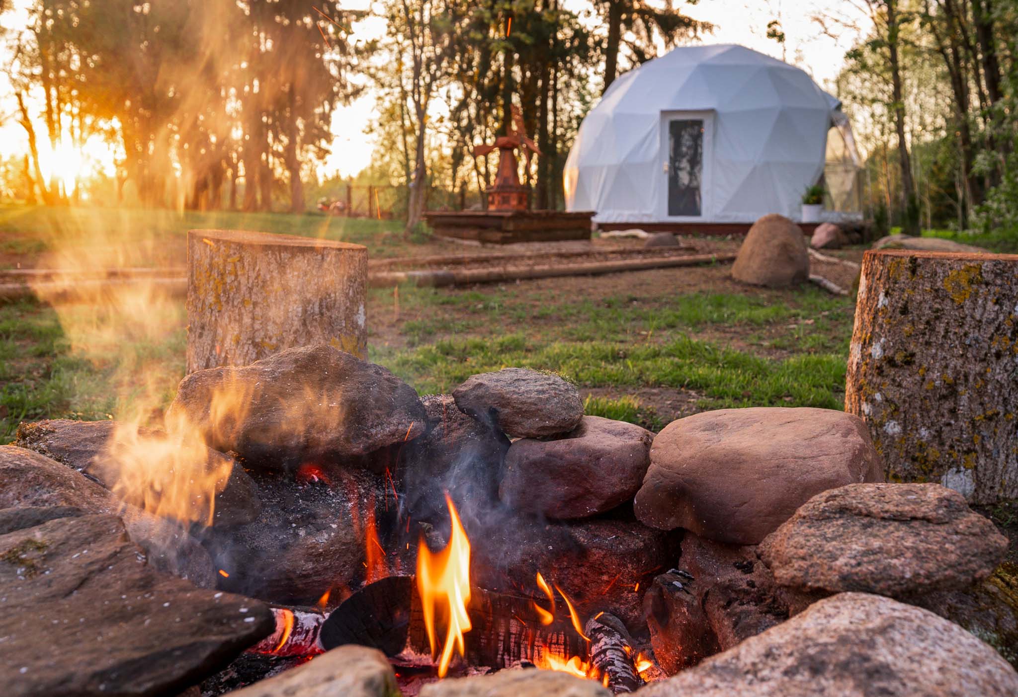 noorpaari kihlusele – saunaesine terrass kaunistatud küünaldega, valgustketid kuppelmaja, tiigi